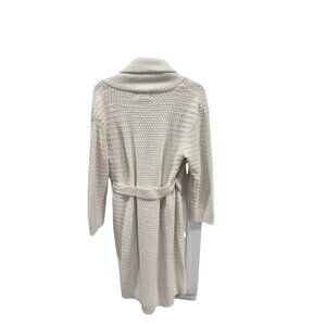 Features a warm waffle-textured chenille knit, shawl collar, removable belt, and deep front pockets.