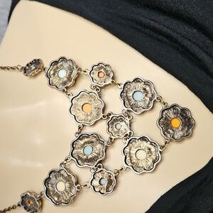 Bib style Statement necklace brass look metal with orange,blue, and white stones.