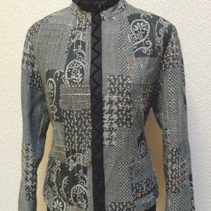 COLDWATER CREEK WOMENS JACKET BLAZER SZ PL GRAY GEOM BLACK TRIM BUTTON UP LS