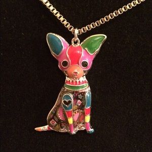 Maxi Statement Enamel Jewelry Chihuahuas Dog Necklace & Pendant. Fashion. New. Woman. Multicolor. Necklace 20 inches. Extender 3 inches. Necklace is Silver. Backing & Outline is Silver.