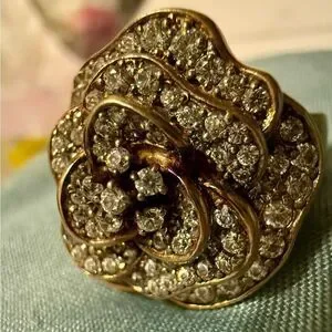 ✨ Make a bold statement with this breathtaking vintage-inspired rose ring, drenched in pavé-set cubic zirconia stones. The triple-layered petals shimmer with every movement, catching the light from every angle. The golden setting adds warmth and elegance, giving it a timeless charm.