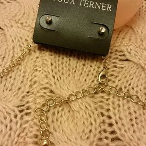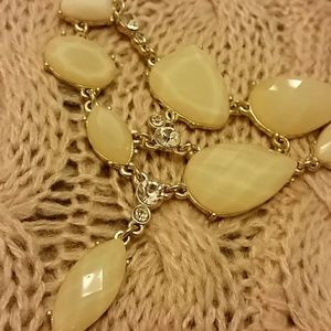 Cream color stones accented by rhinestones in this cute asymmetrical style necklace. Post earrings with small rhinestones. Gold tone necklace measures 17.5" with a 4" adjustable chain. NWT