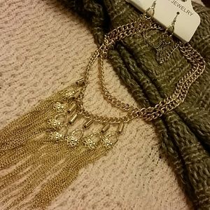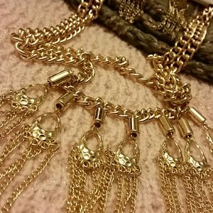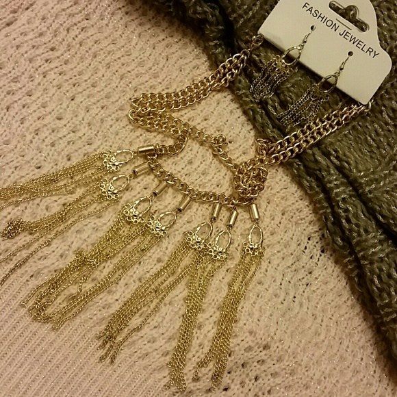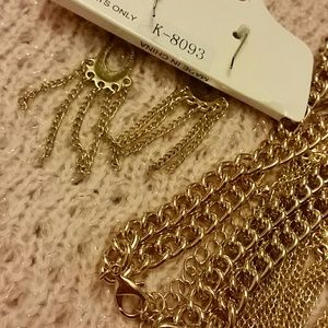Gold tone thick chain necklace is accented with oval drops and multi chains. Matching drop earrings. Necklace measures 17" with 3" adjustable chain. Earrings measure 3". Notice a few little knotted link areas in the fringe at base of the necklace. Will reduce a few dollars die tutu this issue. NWOT