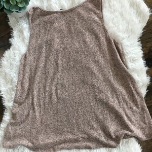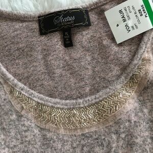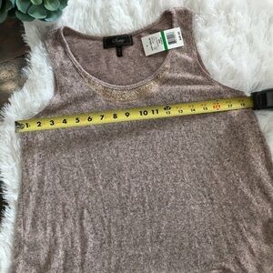 Sooo soft... Status by Chenault Sleeveless soft fuzzy top. Gorgeous decorative neckline. Color is Blush per tag. New w/tag. This is perfect for pants or jeans. Size Petite large. Approximate measurements on photos.
