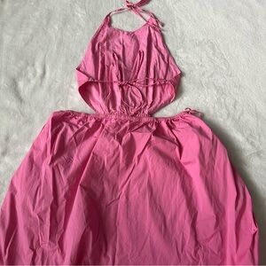 Side cutouts show cheeky peeks of skin on this otherwise totally elegant pink cotton halter gown by Staud.