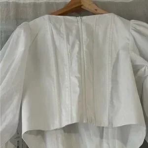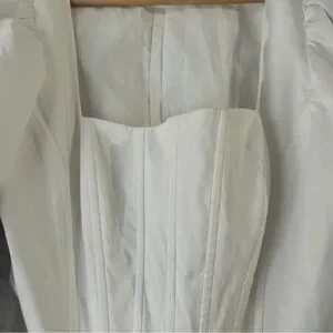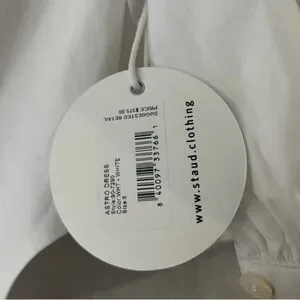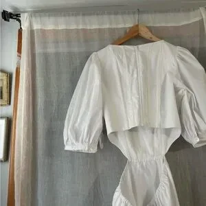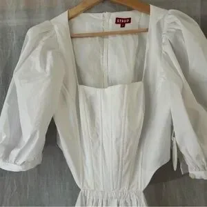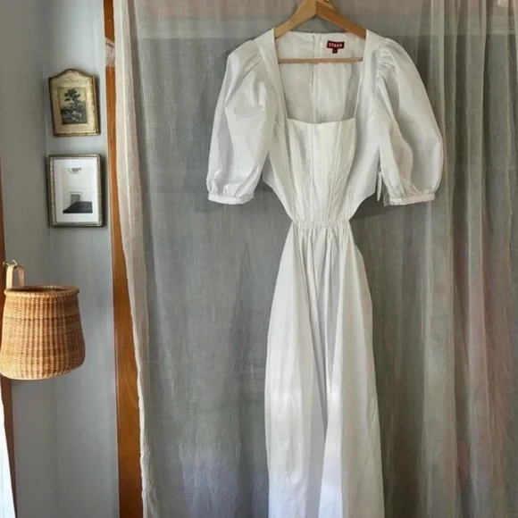 STAUD Astro Maxi Dress. Boned bodice. White. Elbow length puffed sleeves with button cuffs. Cut out waist. Square neckline. Exposed zip located at the back of the garment. 98% cotton & 2% spandex. Lining is 100% cotton. Size 8. Never worn. Original tags. Originally $375.