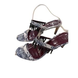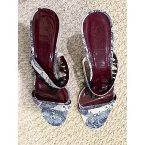 A statement shoe like no other. These sculptural open-toe STAUD heels feature a unique blue-and-ivory toile print canvas, deep wine-colored leather insoles, and dramatic black beaded embellishments across the vamp. The angular stiletto heel adds bold elegance to any look—from resort chic to evening edge.
