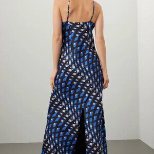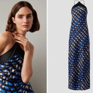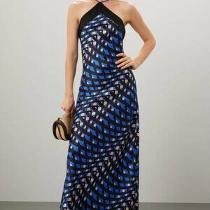 A cascading geometric pattern lights up this satin halter neck gown by STAUD to make you the center of attention at your next event.