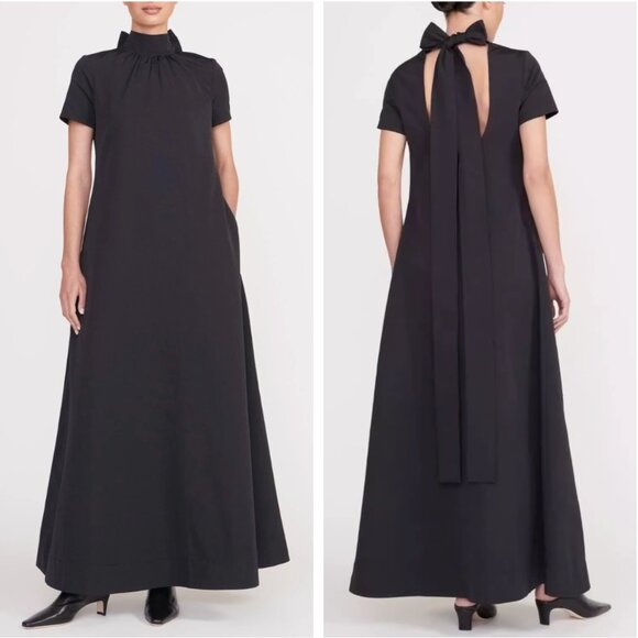Elegant black maxi dress by STAUD. Features a high neckline and open back with bow detail. Short sleeves and flowing silhouette. Perfect for the holidays!