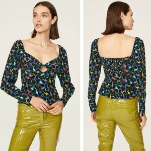 STAUD Black Multicolor Print Smocked L/S Sweetheart Neck Josephine Top Size 12