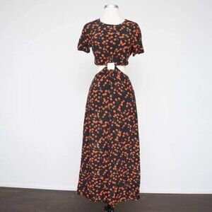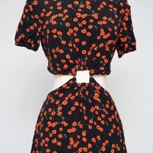 Chic black midi dress with vibrant red floral pattern. Features short sleeves and cut-out waist detail. Perfect for any occasion.