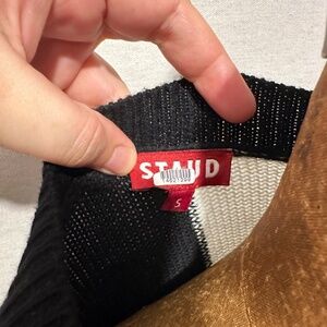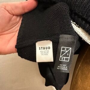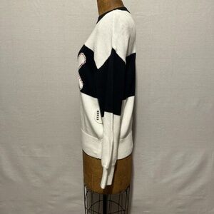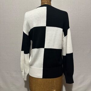 Chic black and white sweater. Crew neck design. Features playful X and O pattern.
