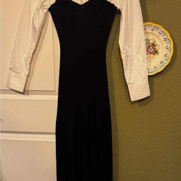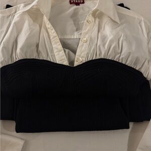 Chic long sleeve dress by STAUD. Features a striking black body with contrasting white sleeves. Perfect for stylish occasions.