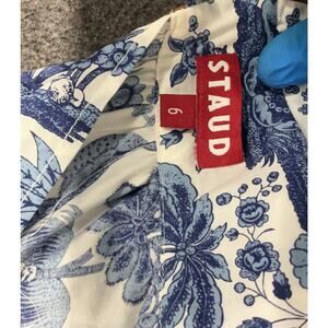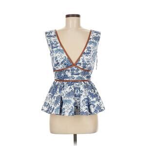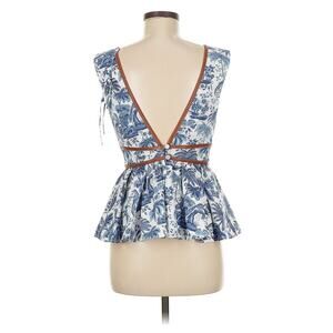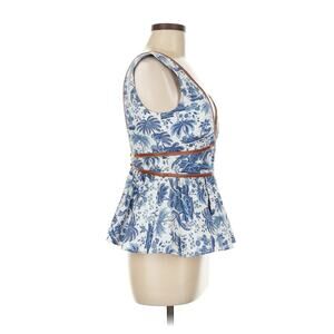 Elegant blouse with blue floral print. Features a flattering V-neck and peplum hem. Brown trim adds contrast.