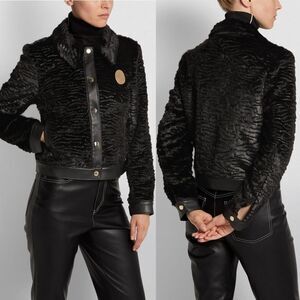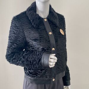 STAUD Buddha Black Faux Fur Jacket Vegan Leather Trim & an Oversized Gold Button