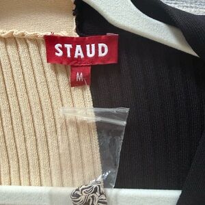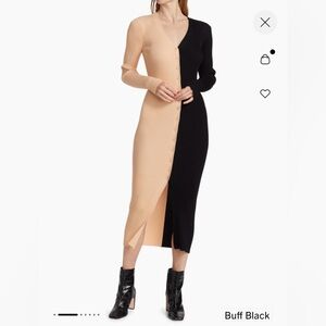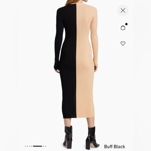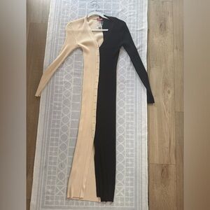 Chic ribbed dress with buff and black contrast. Long sleeves and button detail. Ideal for versatile styling.