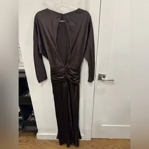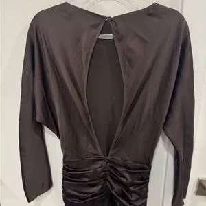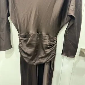 Sophisticated chocolate satin dress. Features long sleeves and elegant design. Ideal for special events.
