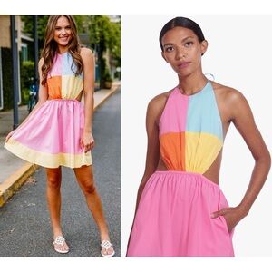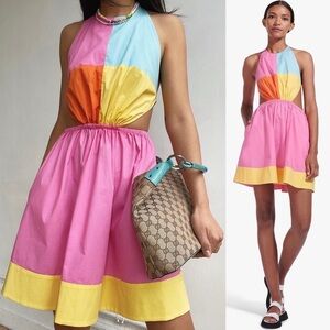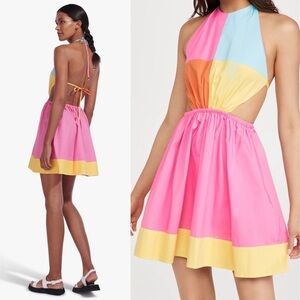 STAUD Colorblock Sleeveless Cutout Halter Neck Open Back Flare Skirt Dress S