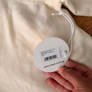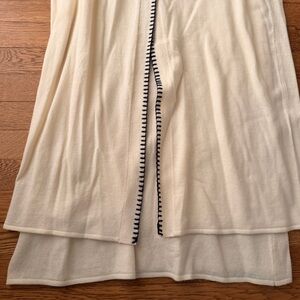 Chic long sleeve dress by STAUD. Cream color with black trim detail. Perfect for elegant occasions. The dress is XL. Comes with the long cardigan size large. Brand new no defects
