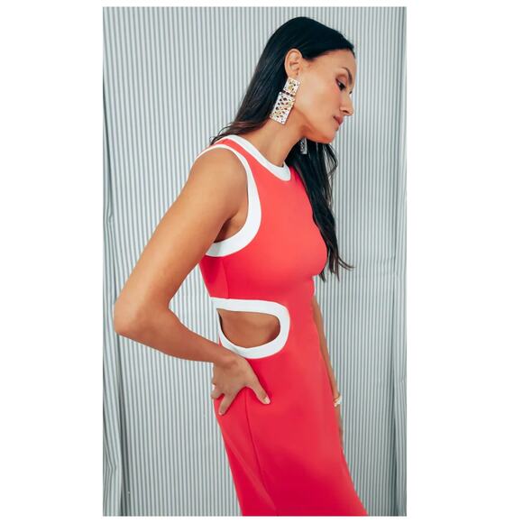 The STAUD Dolce dress is a maxi dress with a two-tone ponte fabric and features cutout detailing on the sides. It has a concealed hook and zip fastening at the back. The dress is mid-weight and slightly stretchy. It features side splits and a sleek, figure-hugging silhouette.