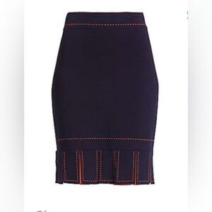 This sophisticated black pencil skirt by STAUD is designed for work and cocktail occasions, featuring a knee-length cut and elegant pleated details at the hem. The sleek silhouette is enhanced by the pleats, adding a touch of movement and dimension to the classic style.