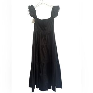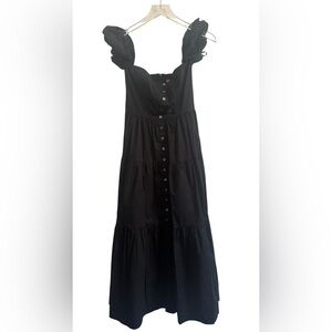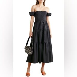 Our off-the-shoulder Elio Dress features a tiered skirt, adjustable cap sleeves, and a button front closure in our lightweight cotton.