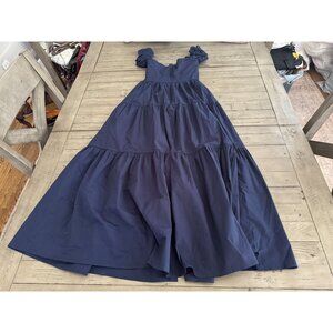STAUD Elio Tiered Cotton Off Shoulder Midi Dress in Navy Blue Size 00
