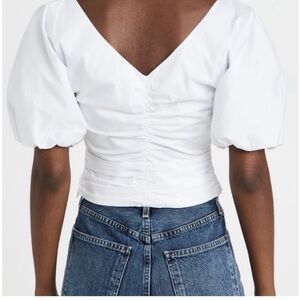 STAUD- Fiona Top Poplin V Neck Puff Sleeve Classic White Ruched Blouse