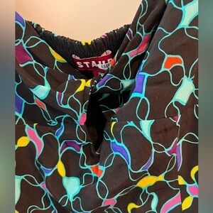 The top features; a keyhole detail at the bodice, sweetheart neckline, long puff sleeves with button cuffs, square back, smocking at back, lined and a hidden side zipper closure.