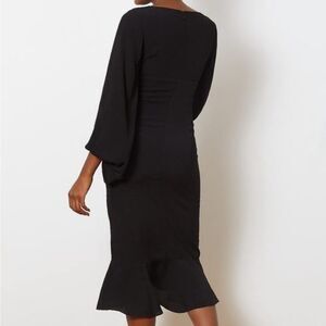 Midi length dress with fitted bodice, curved neckline and a fluted ruffle hem. Cut from a black crepe fabric. Features button details on chest and cinched cuffs for dramatic sleeves. Zip back closure. Lined.
