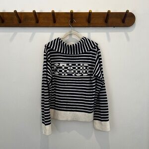 A chic and sporty wool-blend sweater featuring bold logo striping across the chest for a modern, elevated look. Designed with a classic crew neckline and a slightly relaxed fit, this sweater blends cozy comfort with everyday style. Oversized fit and fits a size Small.
