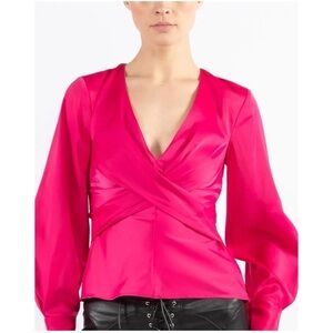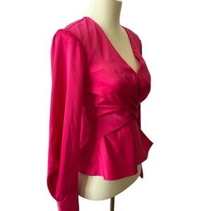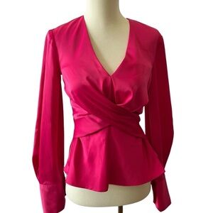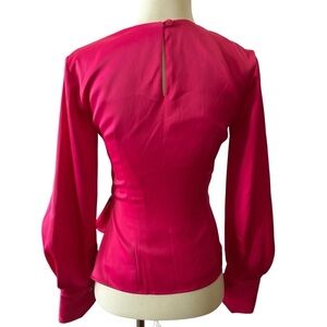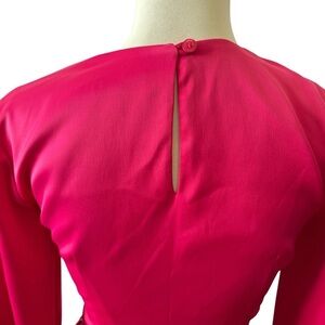 Barbiecore bright pink, womens size 00, long blouson sleeves, v neck, crossover bodice, side zipper, lined, fitted, back keyhole and button at nape.