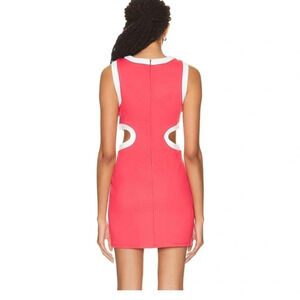 A mini-length, sleeveless ponte dress with waist cutouts and contrast trim.