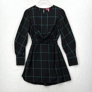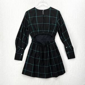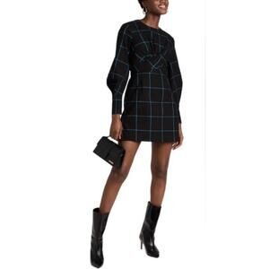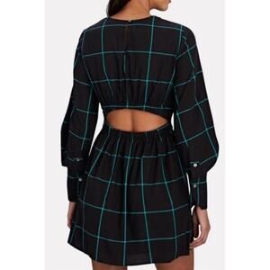 STAUD Mini Crosshill Dress Womens Medium Black Windowpane Blue Check Long Sleeve