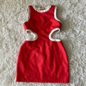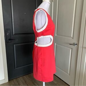 This dress is so much fun! Perfect for summer or a warm weather getaway, the Mini Dolce dress by STAUD features a high neckline, sleeveless top, cut outs at waist, mini length and hidden back zipper closure. The Hibiscus color is a punchy pinky red with contrasting white trim. Only wore once and looking to swap for something new. Excellent condition, super comfortable to wear due to stretch!