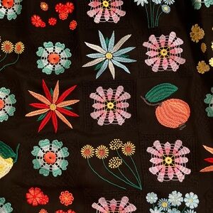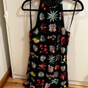 Chic mini dress with vibrant floral design. Black base enhances colorful flowers. Black vegan leather collar. Very cute and sleek but with cottage core vibes!