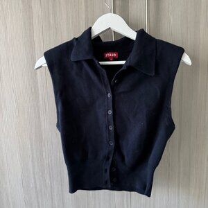 A sleeveless polo top with shoulder pads, the Nola Sweater is made out of a soft cotton cashmere fabric. This style can be worn backwards for a simple mock neck look.
