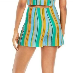 These shorts feature a vertical stripe pattern in blue, green, & orange.