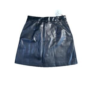 jet black, faux leather, belt loops, front button fastening, two front patch pockets and A-line