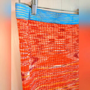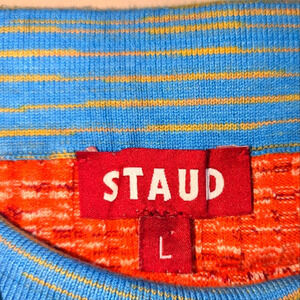 The STAUD Piera Space Dye Mini Skirt in vibrant orange, size Large, features a cozy, sweater-like fabric perfect for cooler days. It has an elastic waistband for comfort, with approximate dimensions of 15 inches at the waist when unstretched and a length of 18.5 inches. This piece is in excellent condition.