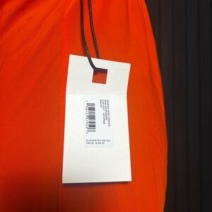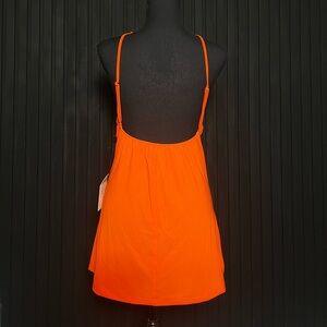 Bright orange backless dress with halter neckline and turquoise beads. Perfect for making a statement. Brand new with tags. Originally goes for $195.