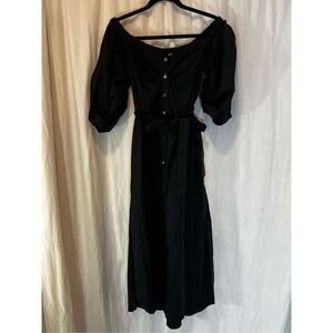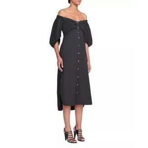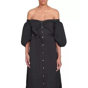 STAUD Reese Women's Black Puff Sleeve Poplin Belted Off-Shoulder Midi Dress Medi