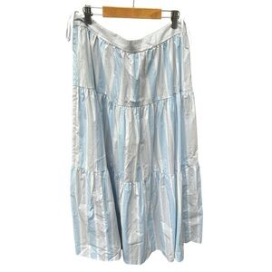Flouncy tiered ruffles bring charm to this softly striped maxi skirt.