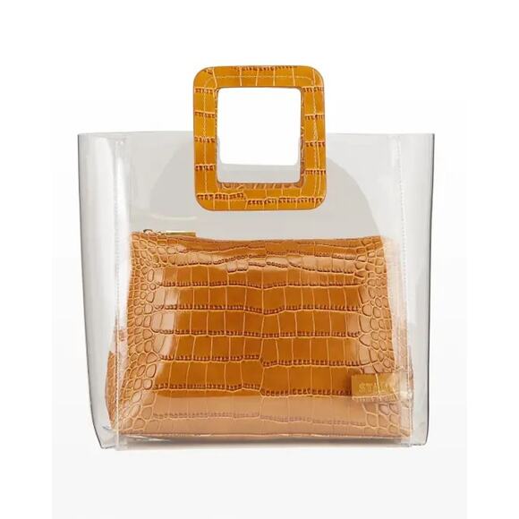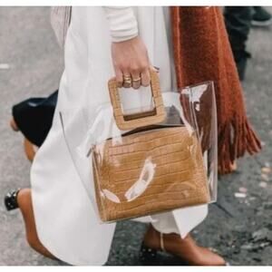 staud shirley tote, clear pvc bag, transparent tote bag, croc embossed handbag, tan brown designer bag, modern minimalist bags, trendy clear handbags, everyday tote women, contemporary designer purse, structured pvc tote, summer handbags women, street style bags, elevated casual