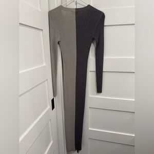 Long sleeve rib knit viscose-blend mid-length dress colorblocked in heather grey & charcoal.