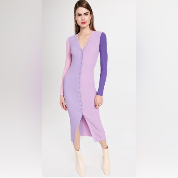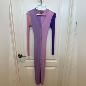 Chic long sleeve dress with a pink and purple colorblock design. Features a ribbed texture and button-down.