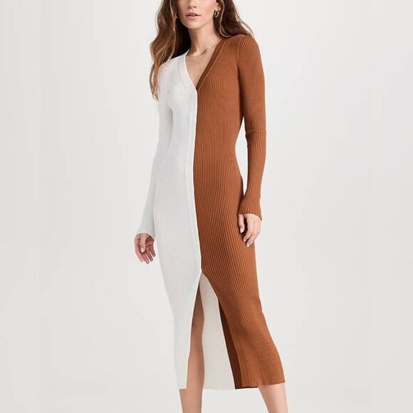 This Shoko sweater dress from STAUD is crafted with Tan and White ribbed knit for a two-tone colourblock design, and features long sleeves, a V-shaped neckline, a front button placket, and a maxi-length hem.