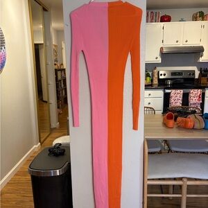Stand out in this vibrant colorblock maxi dress, featuring a striking combination of pink and orange. The ribbed texture adds a touch of elegance, perfect for any occasion.