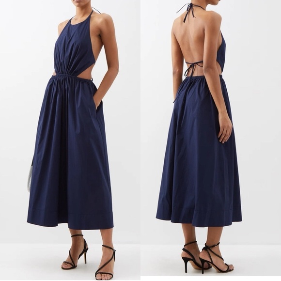 Vanessa halterneck dress by Staud is crafted from crisp cotton-blend poplin with delicate cutouts and glamorous neck and back ties.