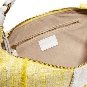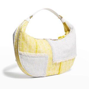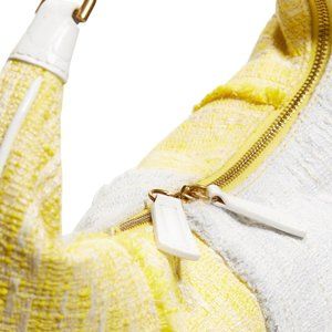 Chic hobo bag with a stylish patchwork design. Features vibrant yellow and classic white tones. Perfect for any occasion.